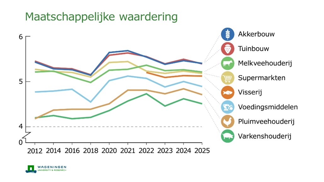 Naast voedselveerkracht kijkt de Agrifoodmonitor ook naar de maatschappelijke waardering voor de Nederlandse agri- en foodsectoren. Die waardering is stabiel en positief. Vooral de tuinbouw en akkerbouw scoren hoog, gevolgd door melkveehouderij en supermarkten. Ook visserij, voedingsmiddelenindustrie, pluimvee- en varkenshouderij scoren voldoende. Daarmee laten Nederlanders zien dat zij waardering hebben voor de bedrijven die hun voedsel produceren, verwerken en verkopen.