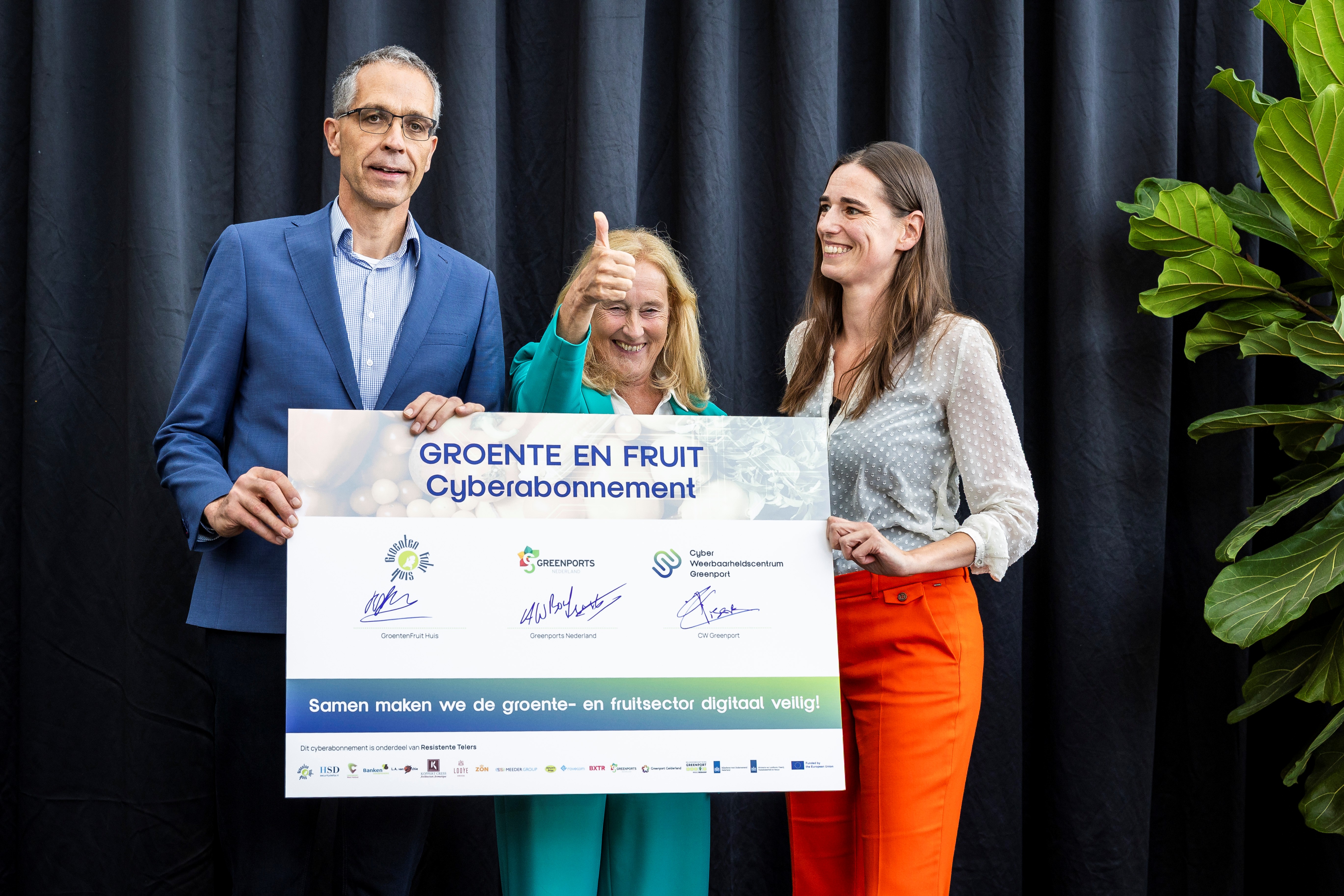 Tijdens het Tuinbouw Congres in Venlo hebben Robert Bakker, Specialist Data & Digitalisering bij GroentenFruitHuis, Adri Bom-Lemstra, voorzitter van Greenports Nederland en Anne Visser, Programmamanager van het Cyberweerbaarheidscentrum Greenport het Groenten en Fruit Cyberabonnement officieel gelanceerd.