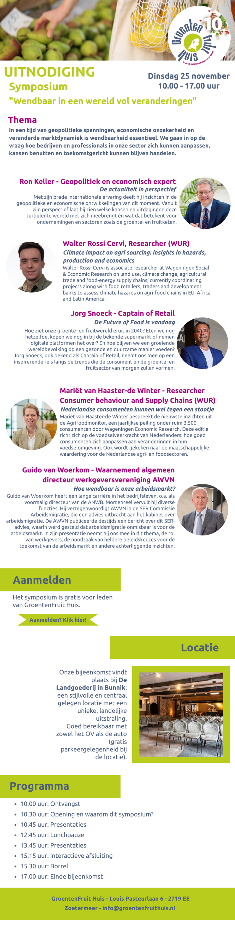 In een tijd van geopolitieke spanningen, economische onzekerheid en snel veranderende marktdynamiek is wendbaarheid belangrijker dan ooit. De groente- en fruitsector wordt dagelijks geconfronteerd met nieuwe uitdagingen: verschuivende handelsstromen, strengere eisen op het gebied van duurzaamheid en voedselveiligheid, veranderend consumentengedrag en voortdurende druk op logistieke ketens en arbeid.