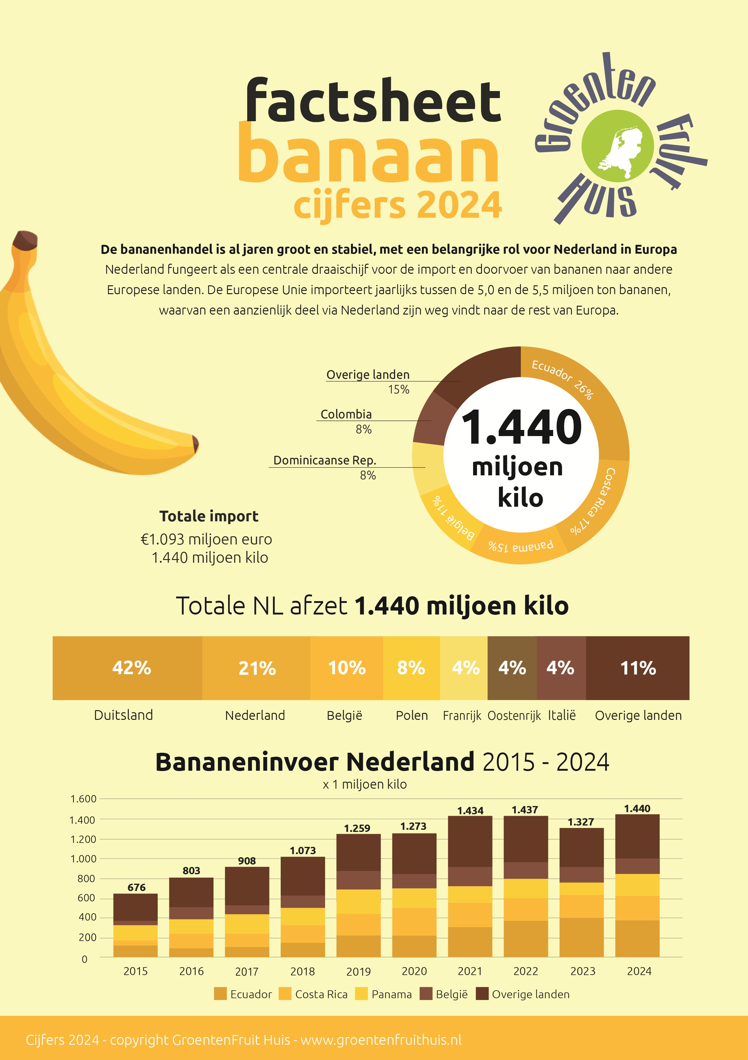 De handel in bananen is al jarenlang zeer groot en stabiel, waarbij Nederland een belangrijke rol speelt binnen Europa. Nederland fungeert als een centrale draaischijf voor de import en doorvoer van bananen naar andere Europese landen. De Europese Unie importeert jaarlijks tussen de 5,0 en de 5,5 miljoen ton bananen, waarvan een aanzienlijk deel via Nederland zijn weg vindt naar de rest van Europa. Dit en meer is te vinden in de Factsheet banaan van GroentenFruit Huis.